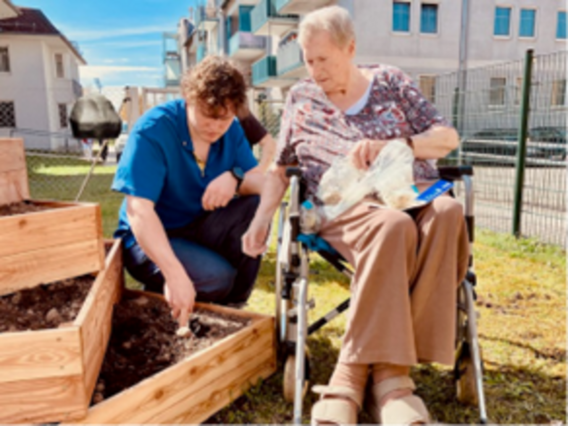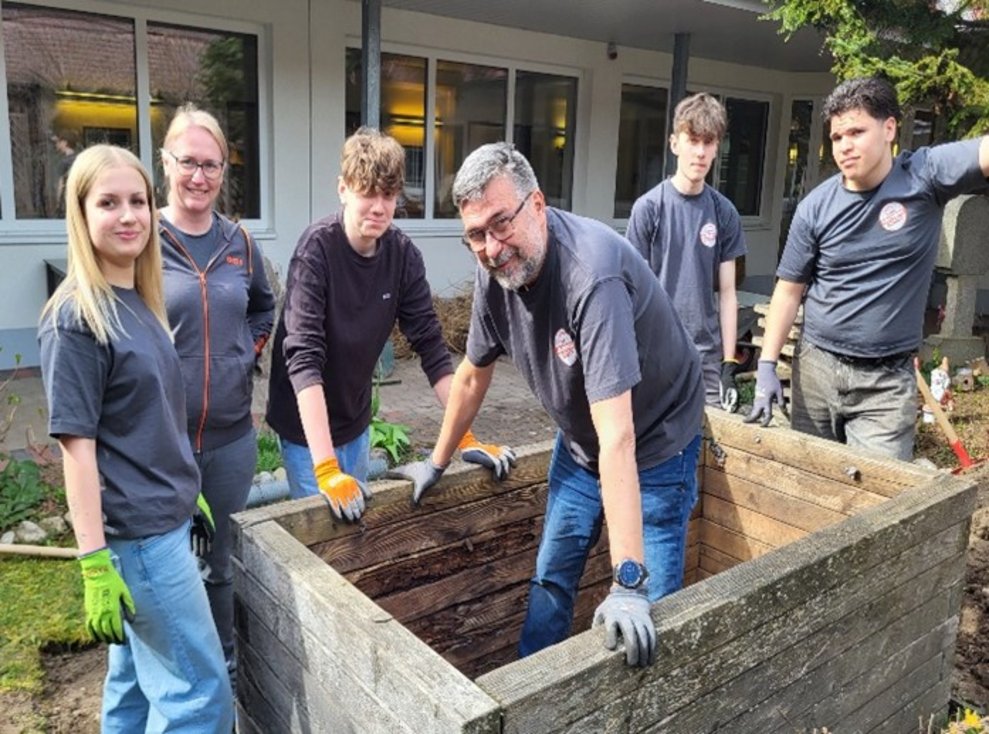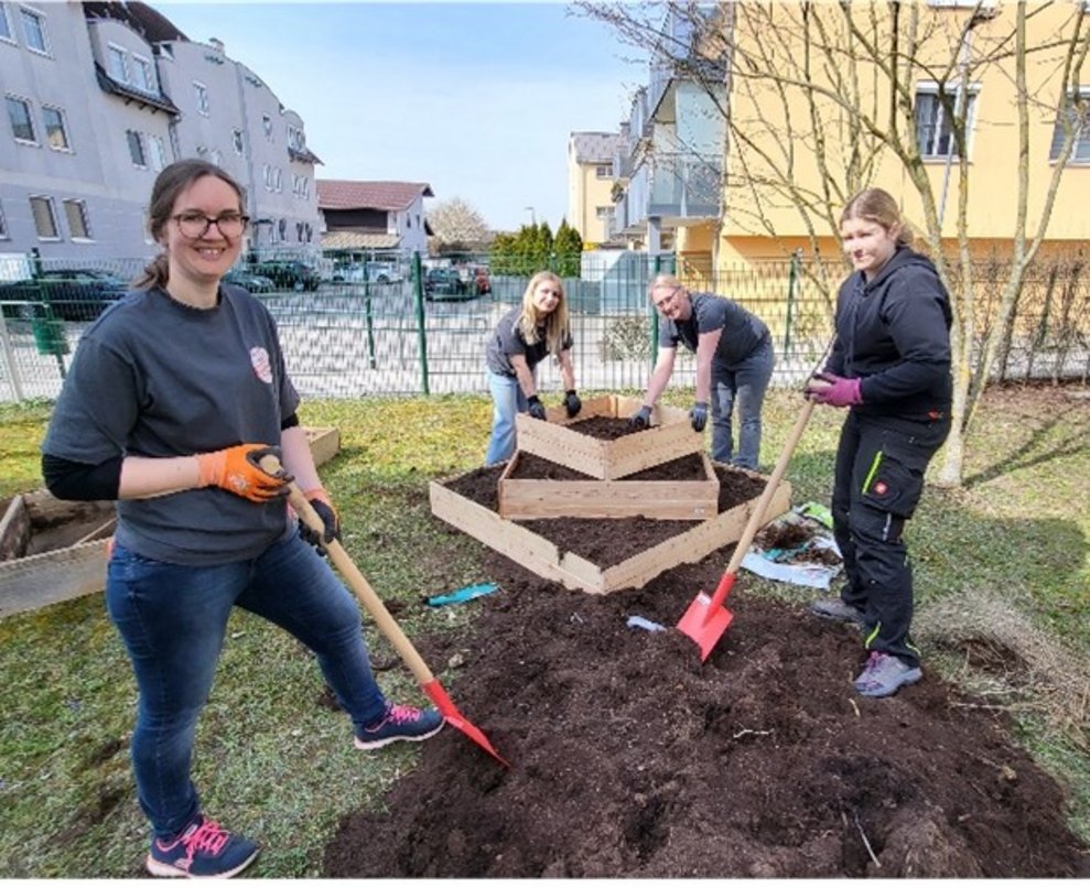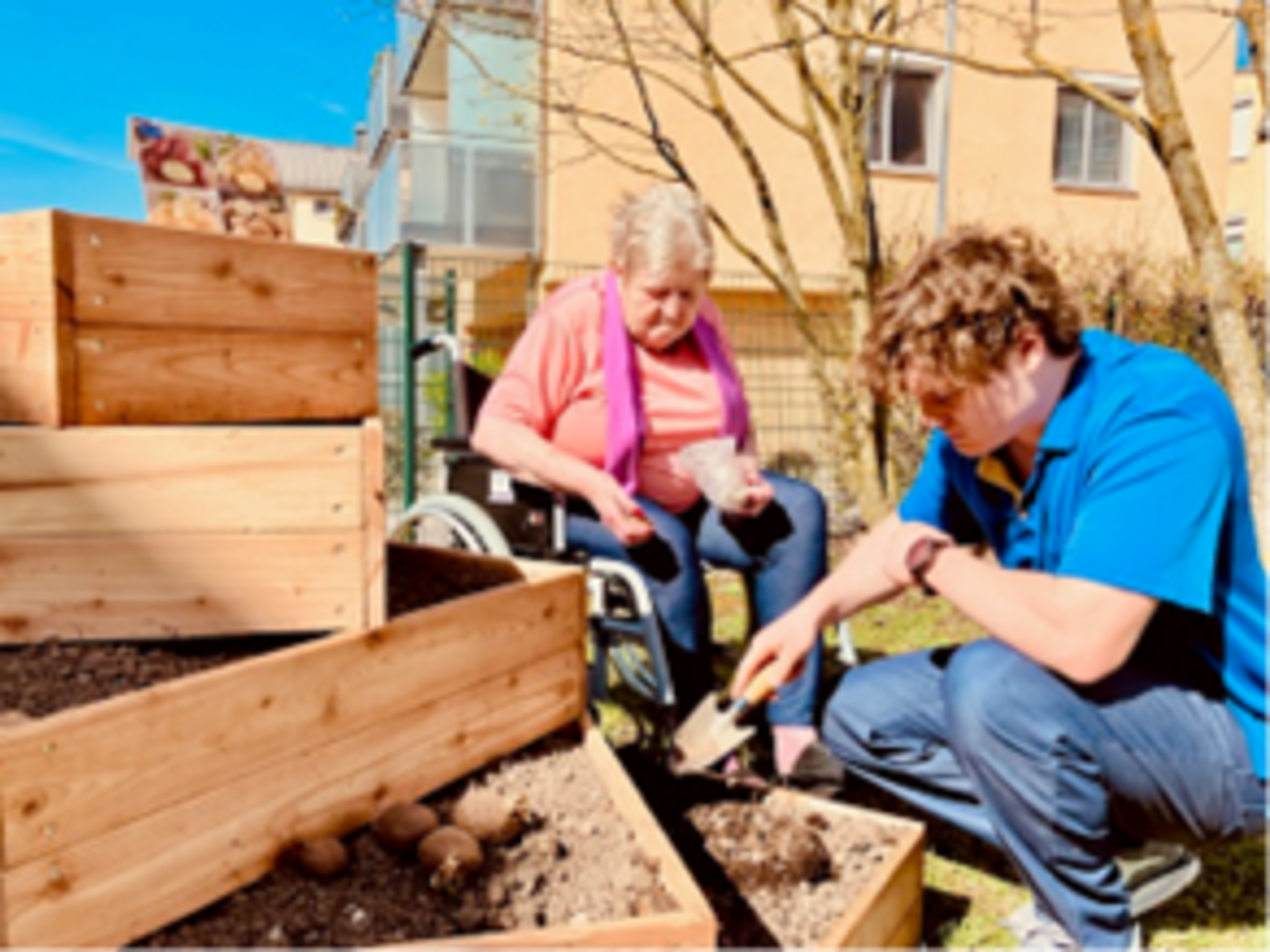 Bei uns wurde der Wassergarten neu gestaltet und im Wohnbereich 4 ein Hochbeet angelegt. In einigen Vorgesprächen wurde thematisiert, welche Vorstellungen realisiert werden können und wie die konkrete Umsetzung aussieht.